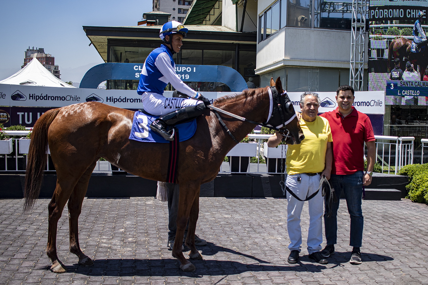 Santa Calma es una hembra de 5 años hija de Aragorn (Giant's Causeway) y La Dormilona por High Pitched. Completa una campaña de 39 presentaciones, dos victorias y 11 figuraciones. Acumula en premios $7.602.500.